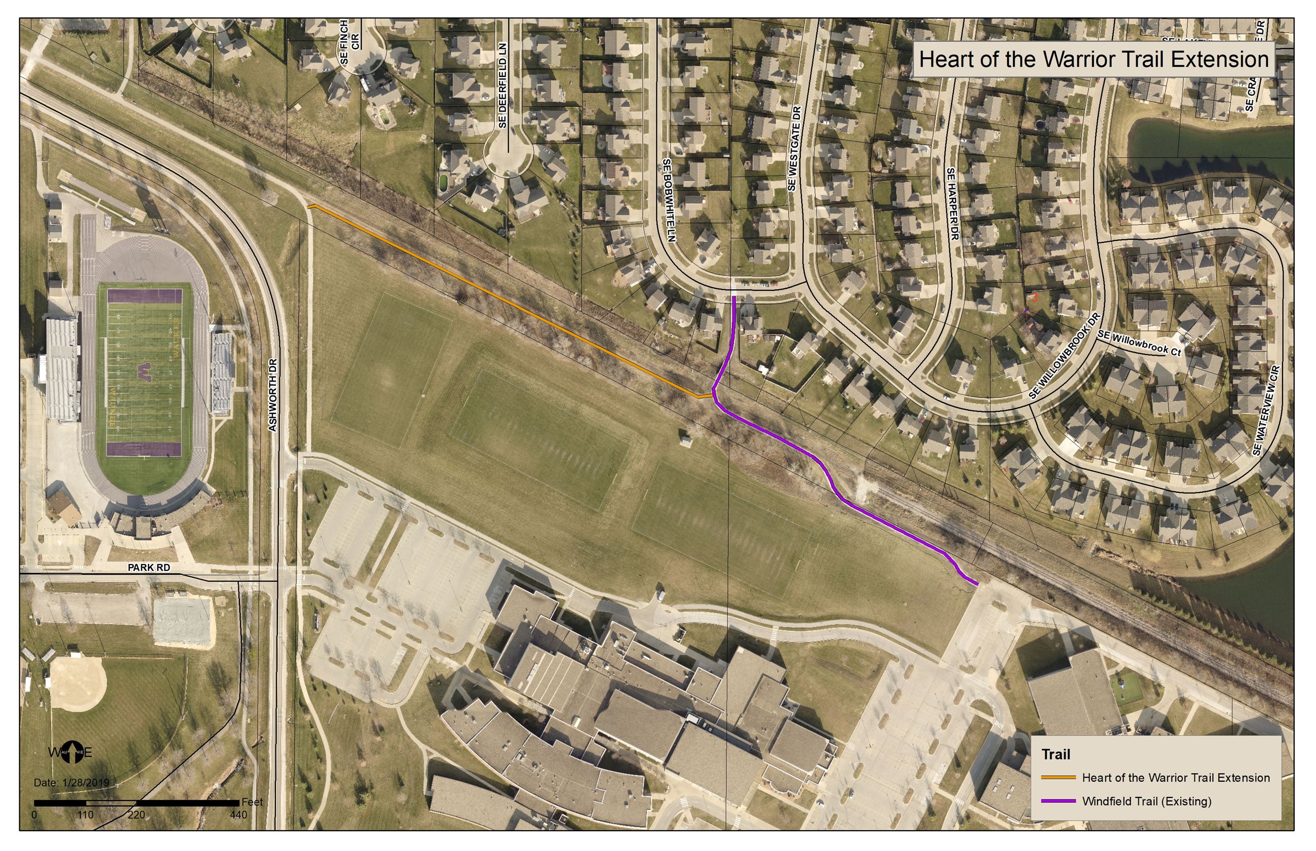 Crews will be adding a trail extension near Waukee High School to connect the small Windfield Trail to the larger Heart of the Warrior Trail. Construction will begin Monday, July 15 and will be substantially completed by Friday, Aug. 2. There will be intermittent trail closures in the area during construction.